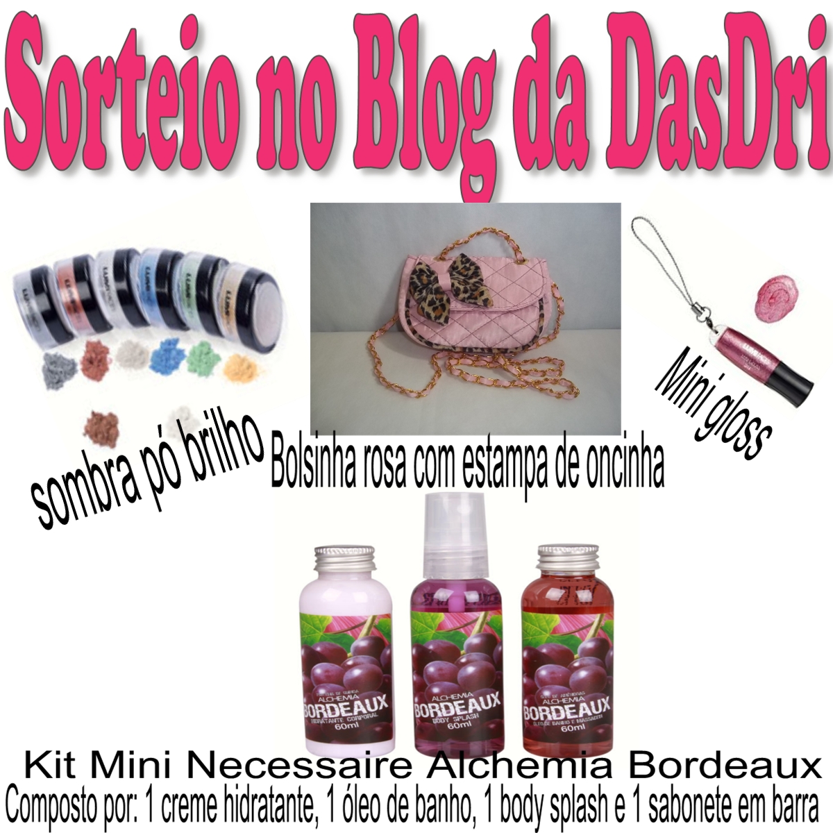 Prêmios: Sombra, Bolsa, gloss e kit de produtos Alchemia